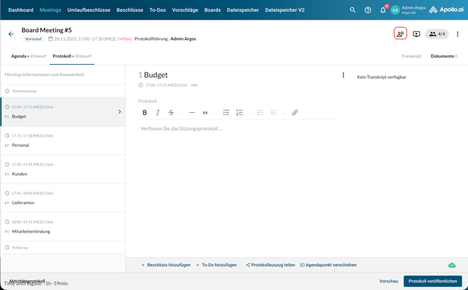 Die vom Bot gesendete Chatnachricht und der rote Punkt in Apollo neben dem Transkript-Symbol bestätigen, dass der Bot erfolgreich zum Call hinzugefügt wurde: