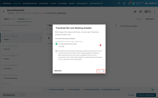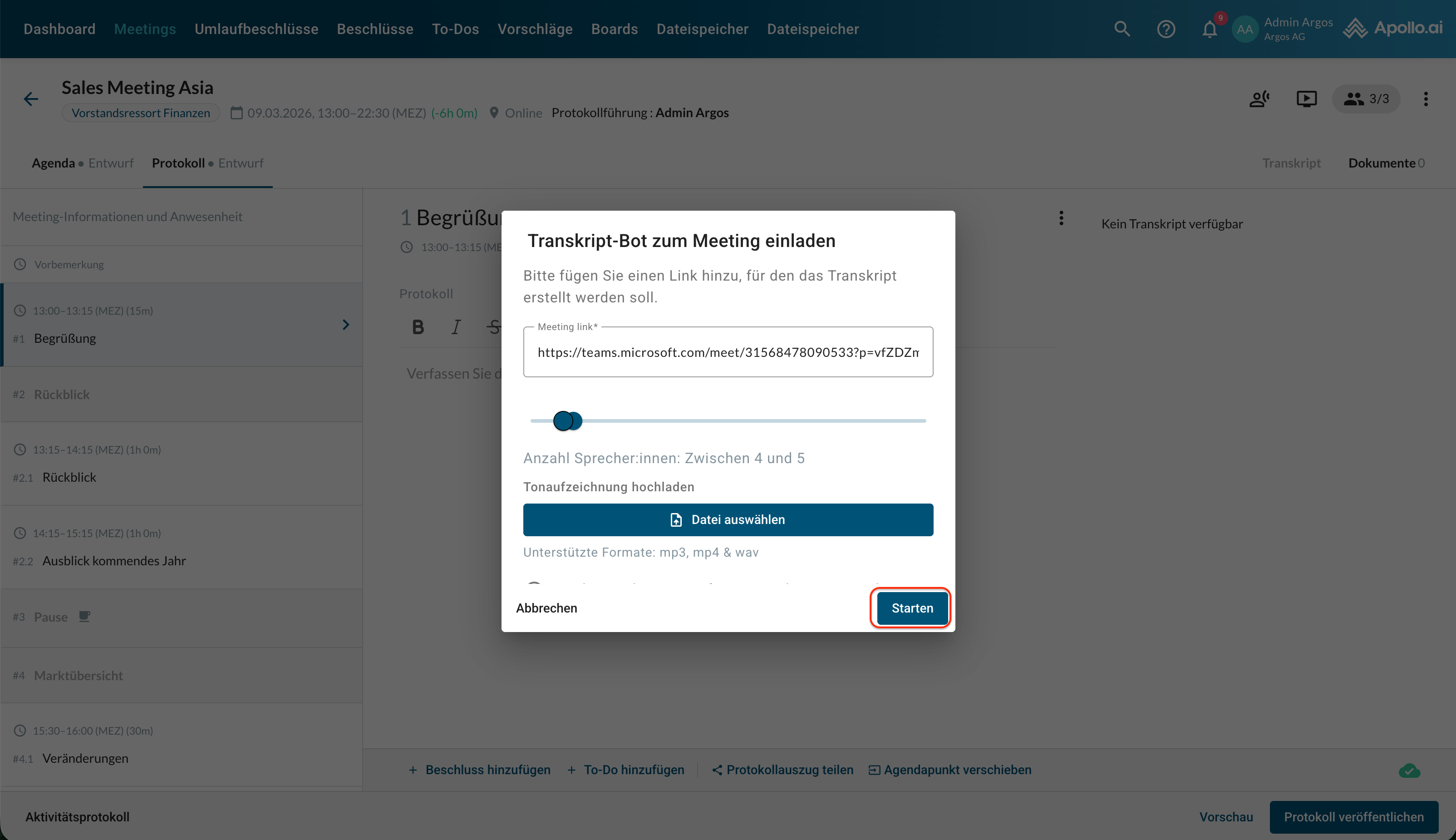 Kopieren Sie den Link zu Ihrem Call und fügen Sie ihn in das entsprechende Feld ein. Wenn Sie den Link bereits beim Erstellen oder Bearbeiten des Meetings in Apollo hinzugefügt haben, wird dieser automatisch für das Transkript übernommen: