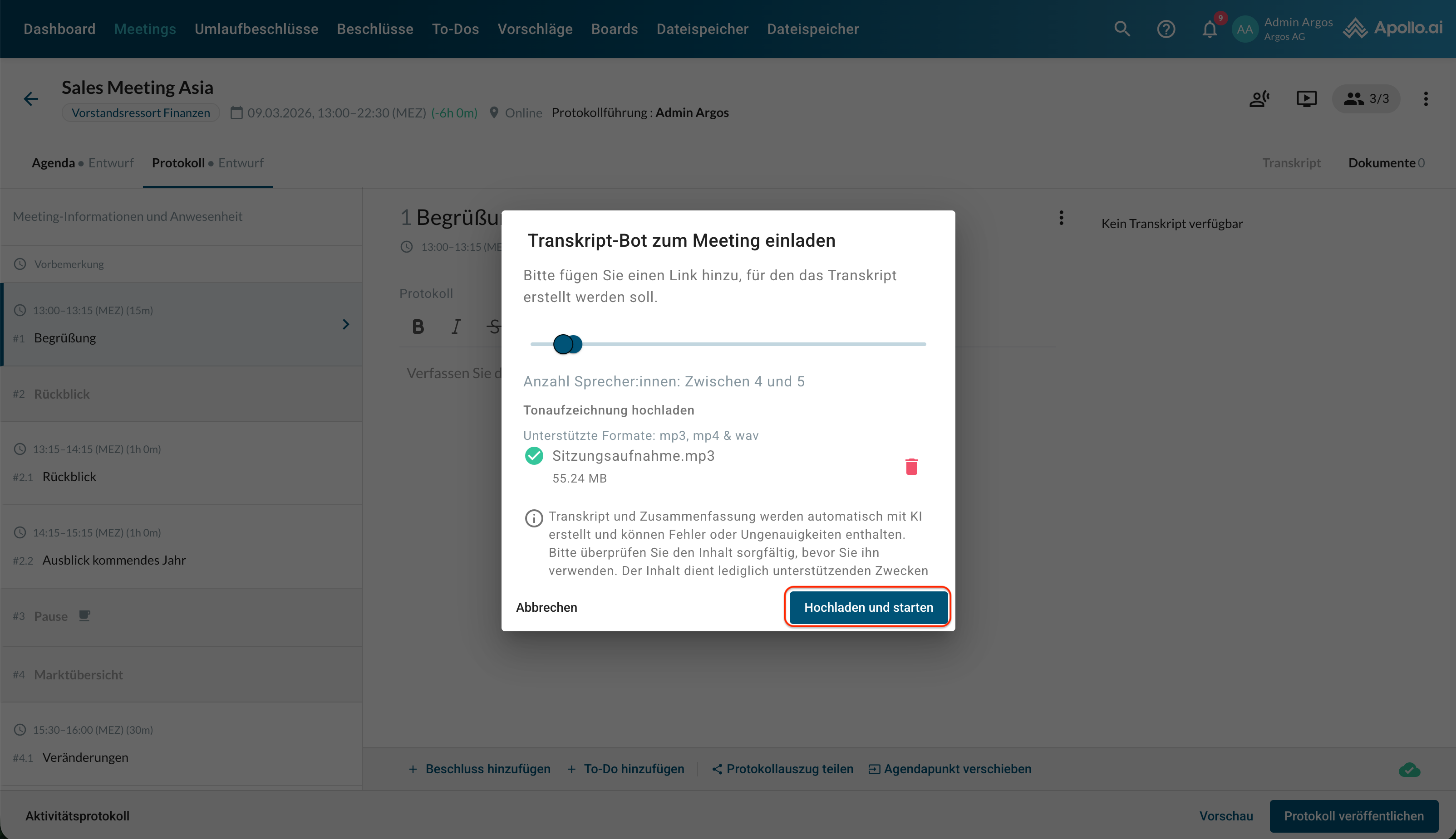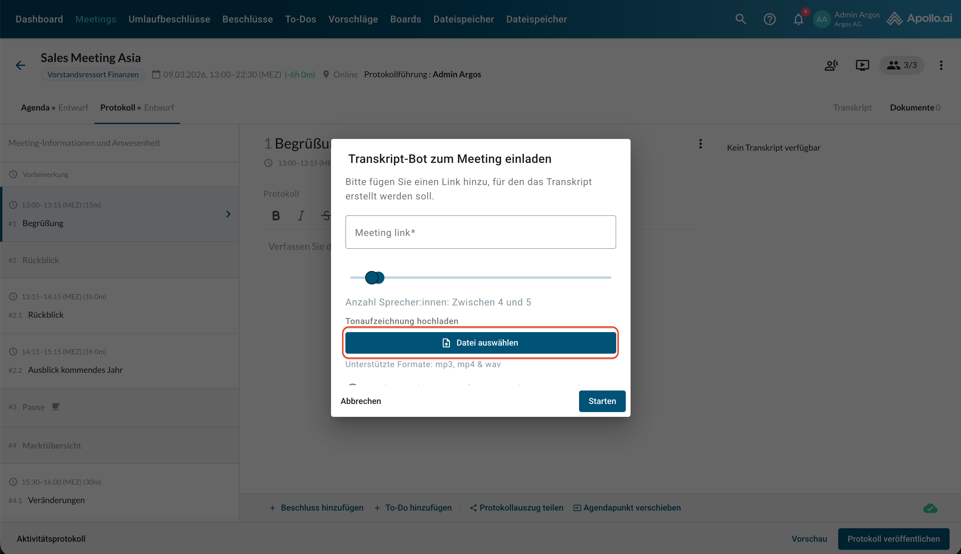 Sie können entweder eine vorhandene Aufzeichnungsdatei hochladen oder den KI-Bot zu Ihrem Online-/Hybrid-Call einladen.