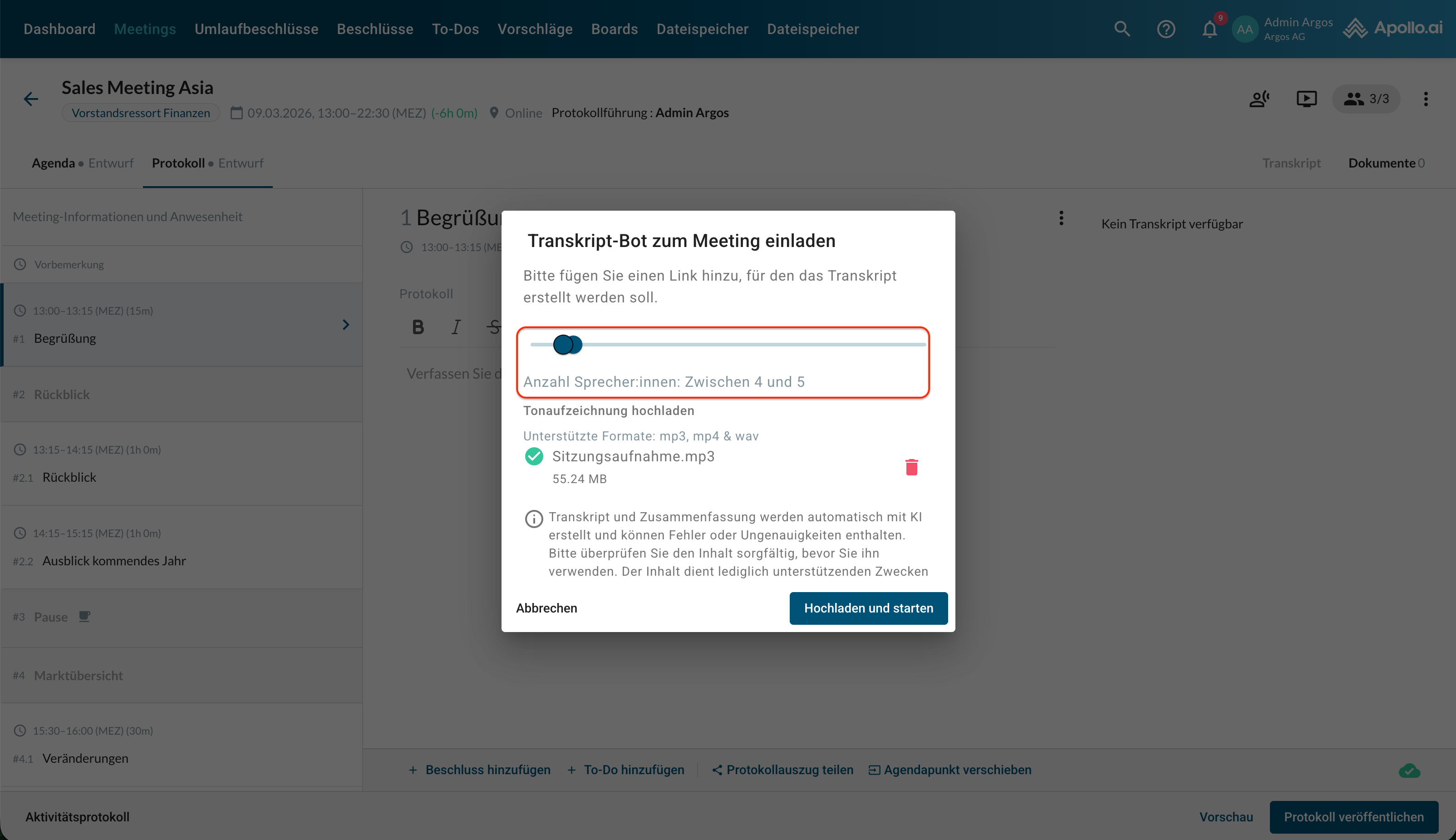 Passen Sie die Anzahl der erwarteten Sprecher an, indem Sie die blauen Schieberegler-Griffe bewegen. Je genauer die Anzahl der Sprecher den tatsächlichen Teilnehmern entspricht, desto präziser wird die KI-Sprechererkennung sein: