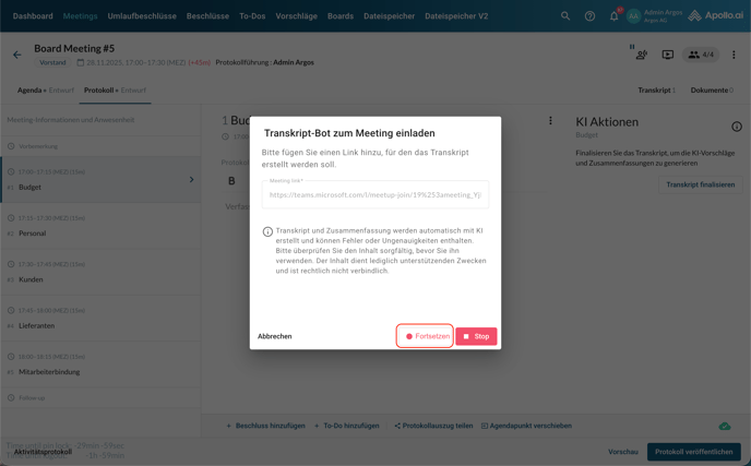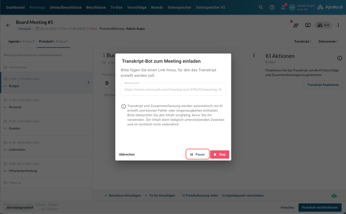 Wenn während Ihres Meetings Themen besprochen werden, die nicht Teil des Transkripts sein sollen, können Sie das Transkript jederzeit direkt über Apollo pausieren. Klicken Sie einfach auf das Transkript-Symbol oben rechts und dann auf „Pause“: