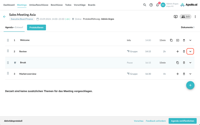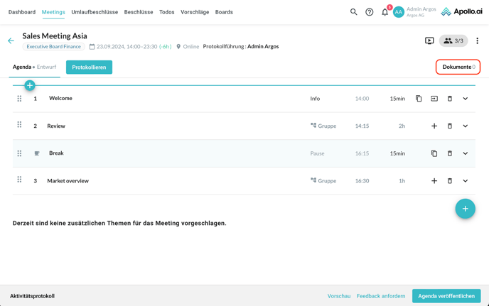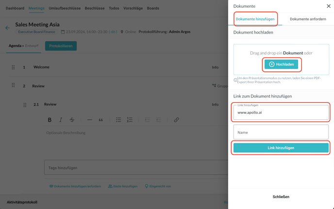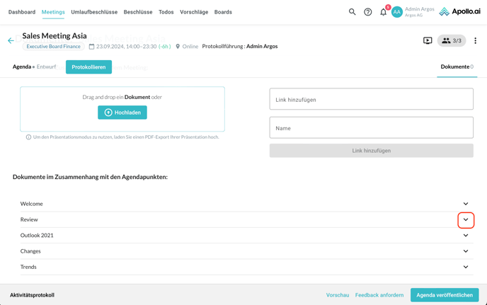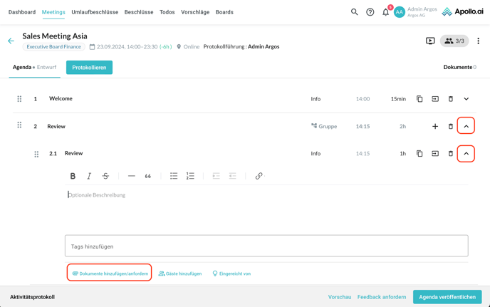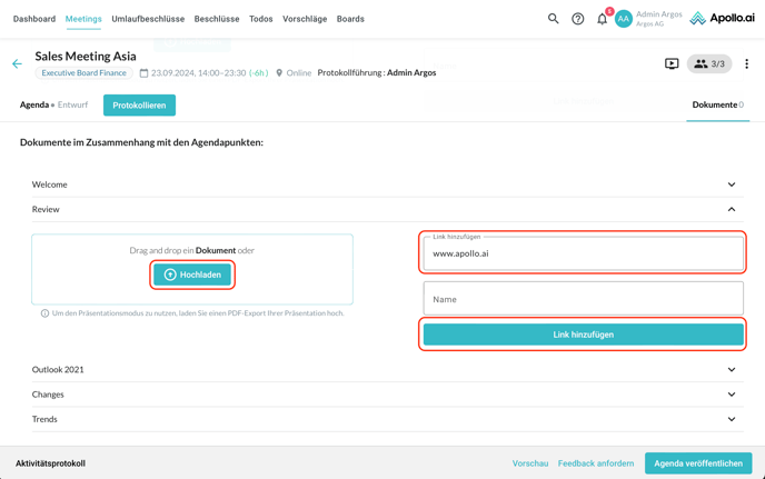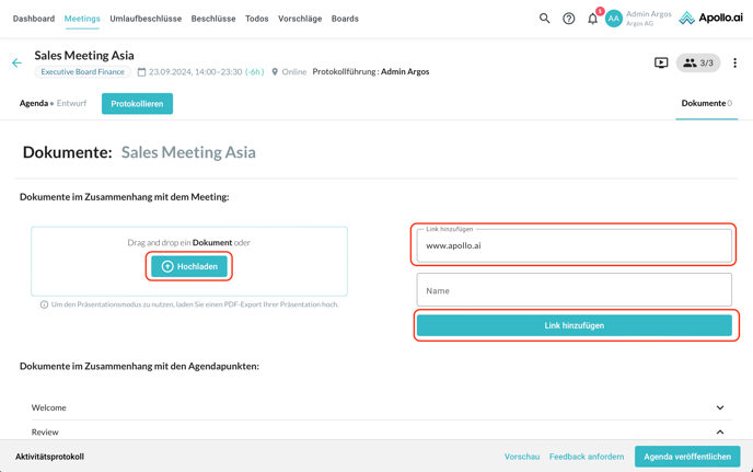 Wenn Sie weiter nach unten scrollen, können Sie Dokumente bzw. Links für die einzelnen Agendapunkte hinzufügen: