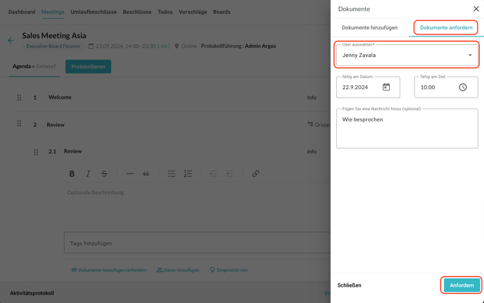 Dokumente für das ganze Meeting oder für einzelne Agendapunkte hochladen; Dokumente für einzelne Agendapunkte anfordern