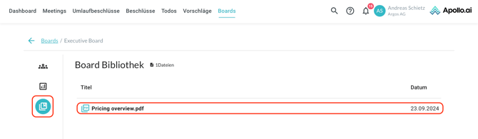 Navigieren Sie zur Board-Bibliothek über die linke Spalte und klicken Sie auf eine Datei, um diese in Apollo.ai zu öffnen: