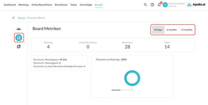 Navigieren Sie zur Seite "Board-Metriken" über die linke Spalte. Sie können nun die Anzahl der gesamten Meetings, Umlaufbeschlüsse, Entscheidungen und To-dos sehen, sowie wichtige Informationen wie durchschnittliche Meetingdauer, Anzahl der Gäste und der an einem Beschluss beteiligten Personen. Wenden Sie die Filter oben rechts an, um den Zeitraum für die Analyse anzupassen: