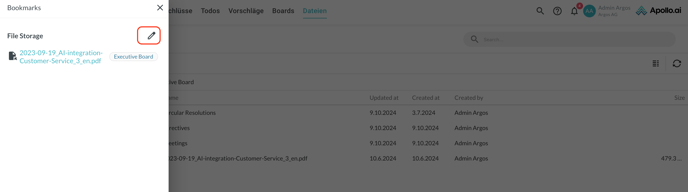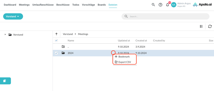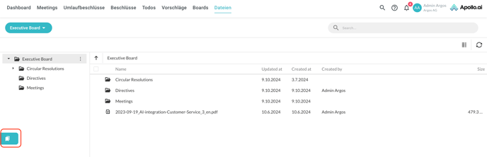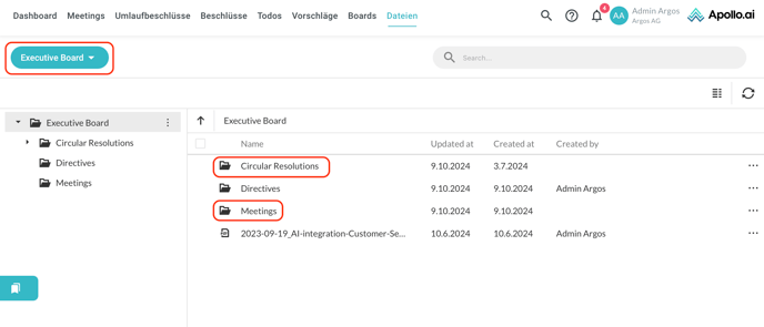 Oben links können Sie nach Board filtern. Die Ordner 'Meetings' und 'Umlaufbeschlüsse' werden für jedes Board vom System automatisch erstellt und gepflegt; Alle Anhänge sind auch enthalten: