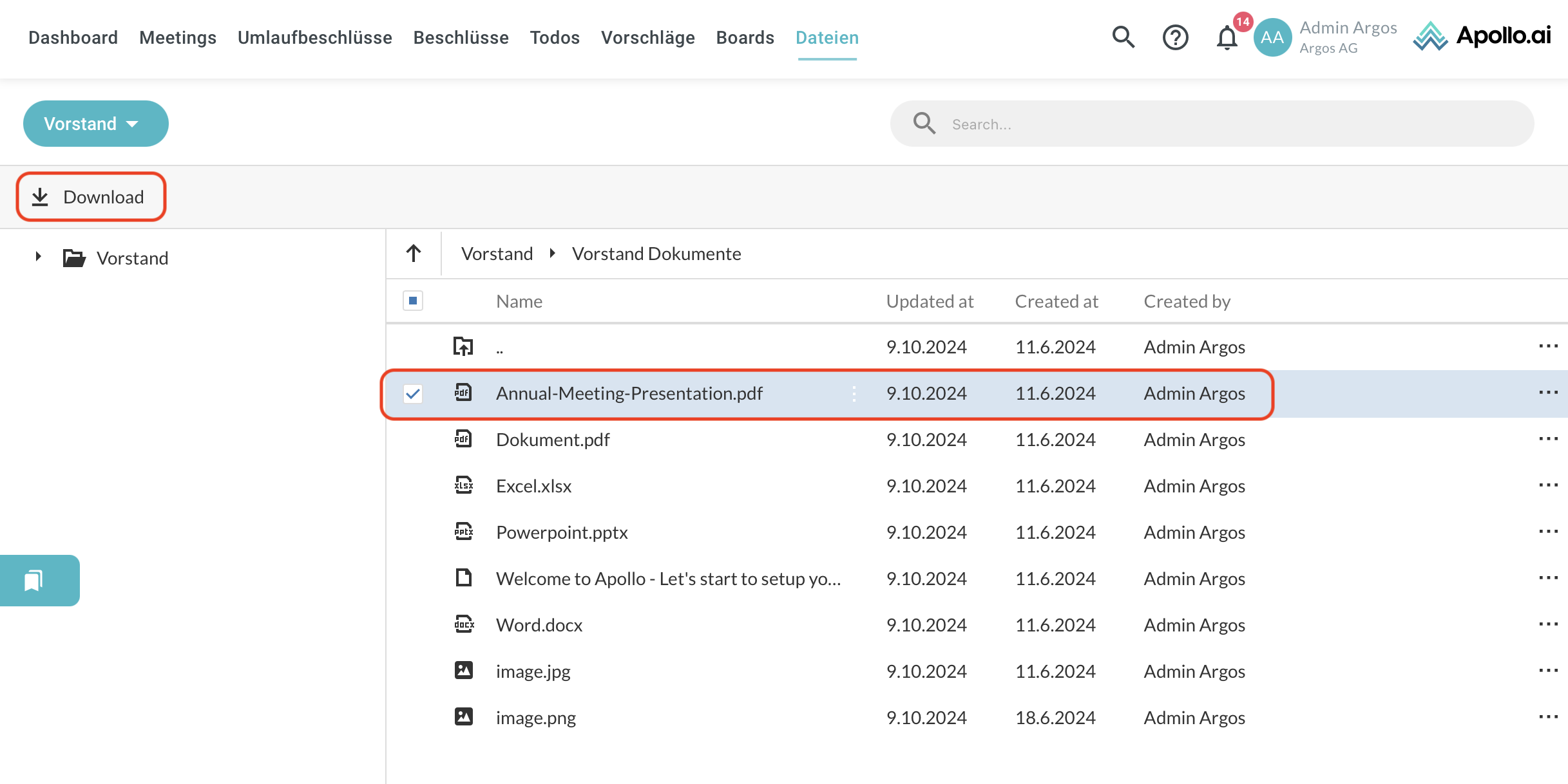 Selektieren Sie die Datei, die Sie herunterladen möchten, dann klicken Sie oben links auf "Download":