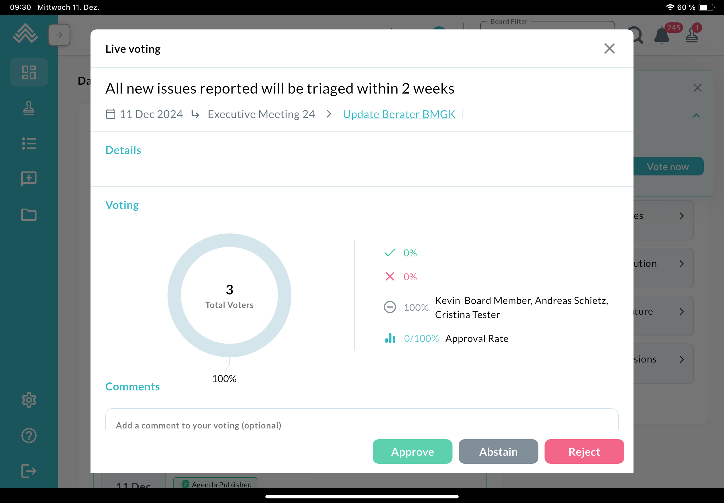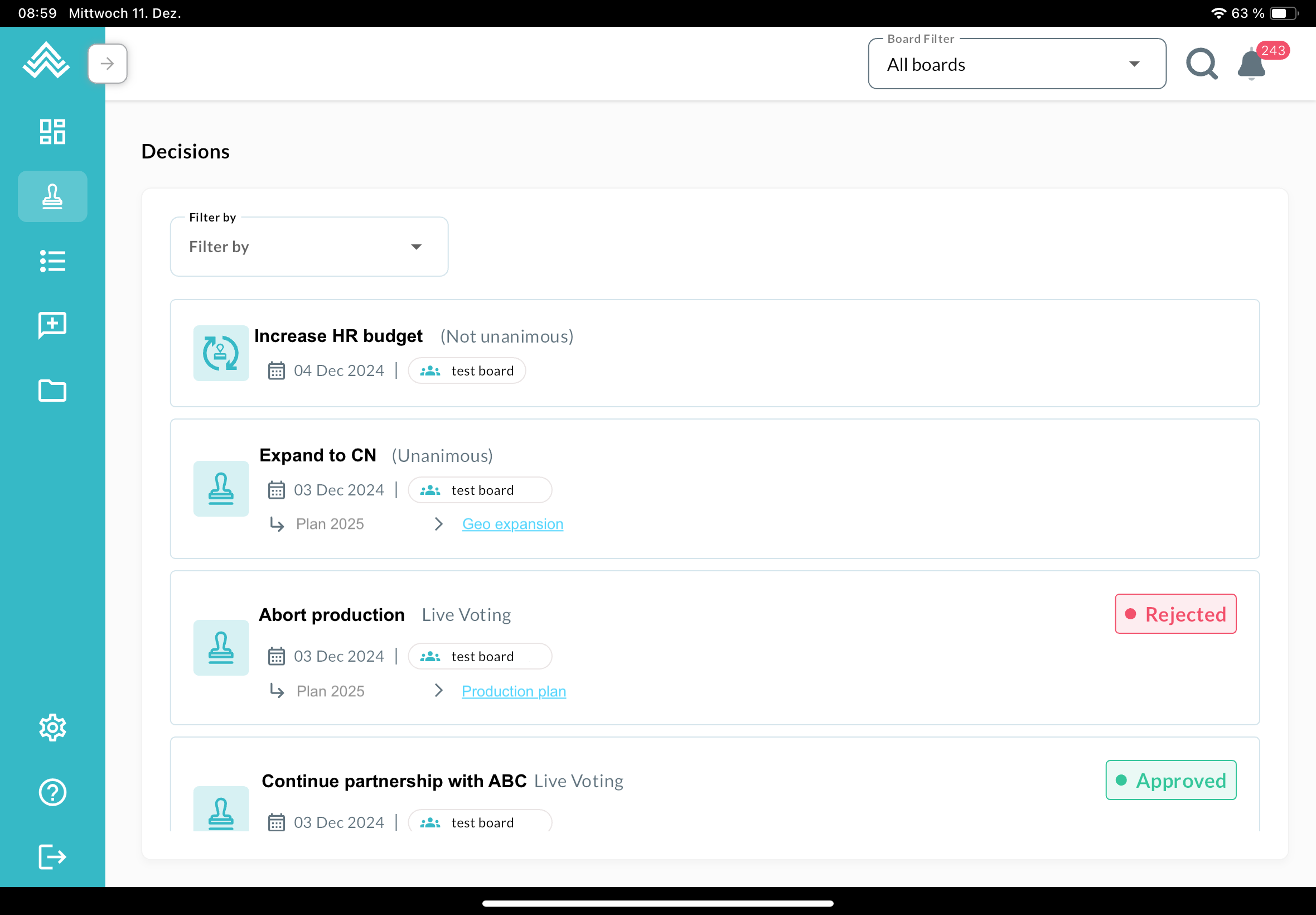 Im Tab „Beschlüsse” können Sie genauso wie in der Web-Version arbeiten: Entscheidungen öffnen, ihren Fortschritt überprüfen, Kommentare hinterlassen und im oberen Bereich filtern: