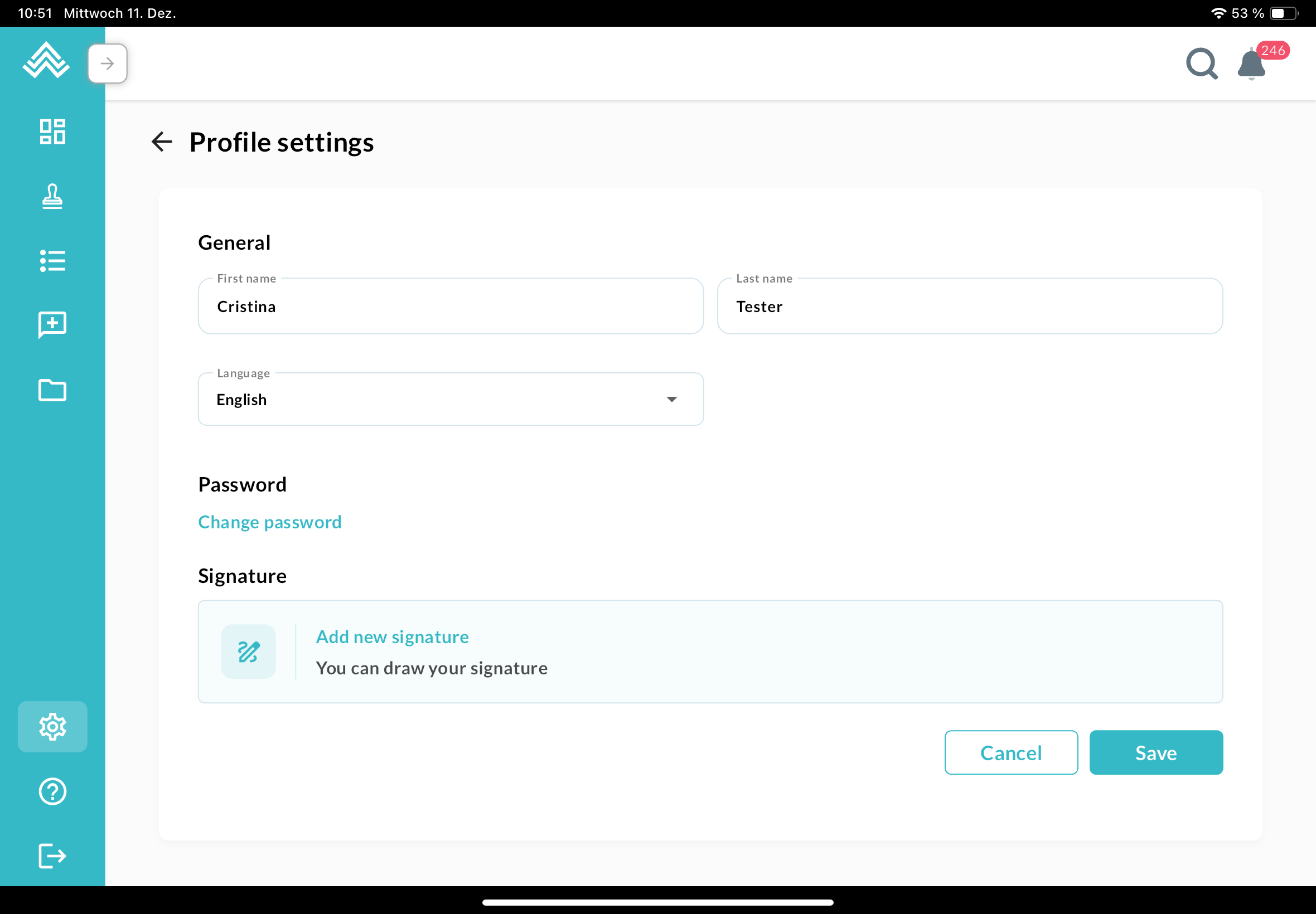 In den Profileinstellungen können Sie Ihren Namen, Ihre bevorzugte Sprache, Ihr Passwort und Ihre Signatur ändern: