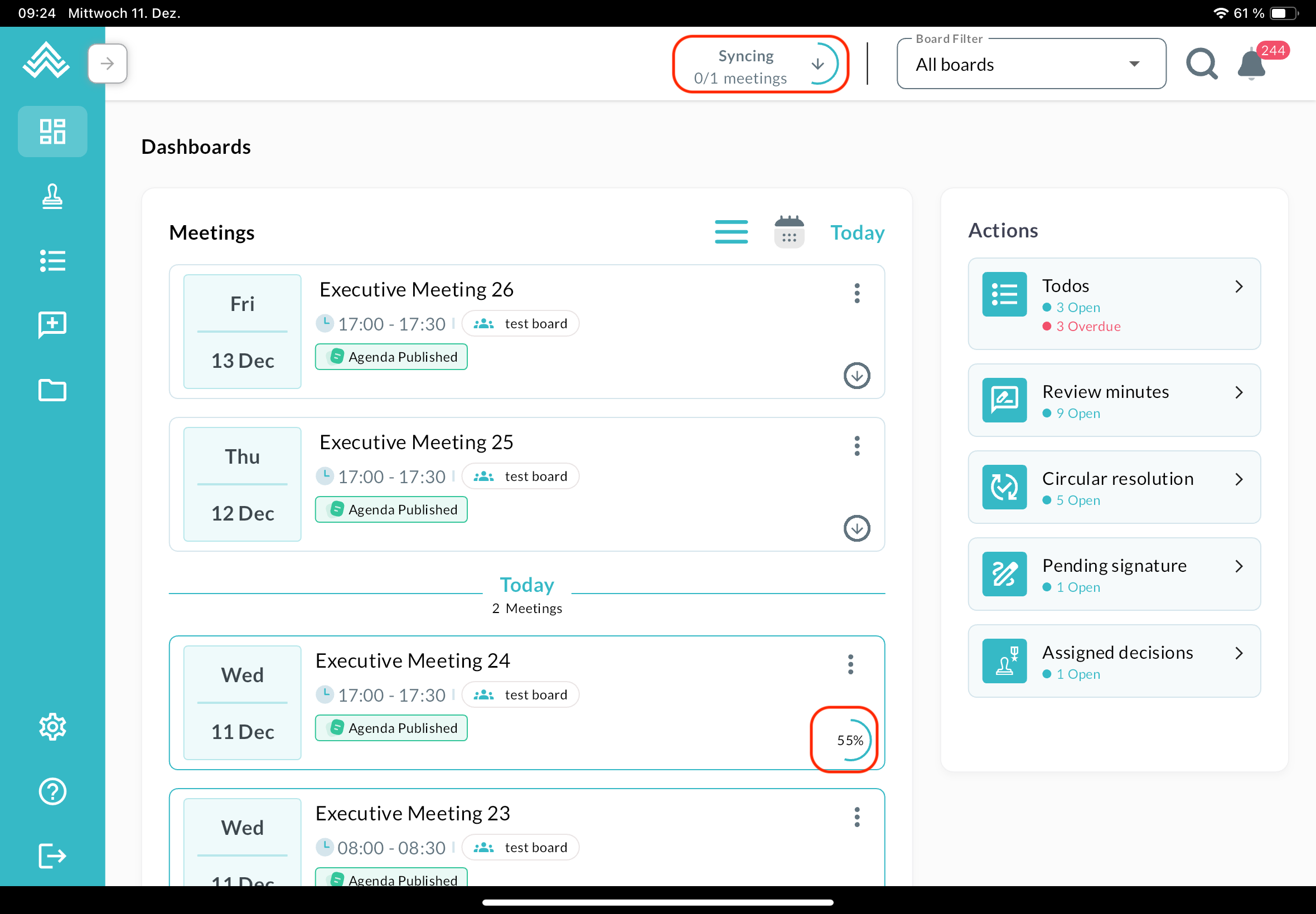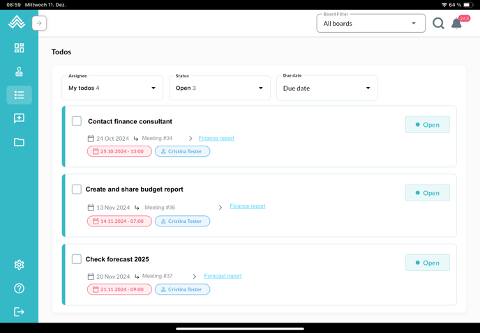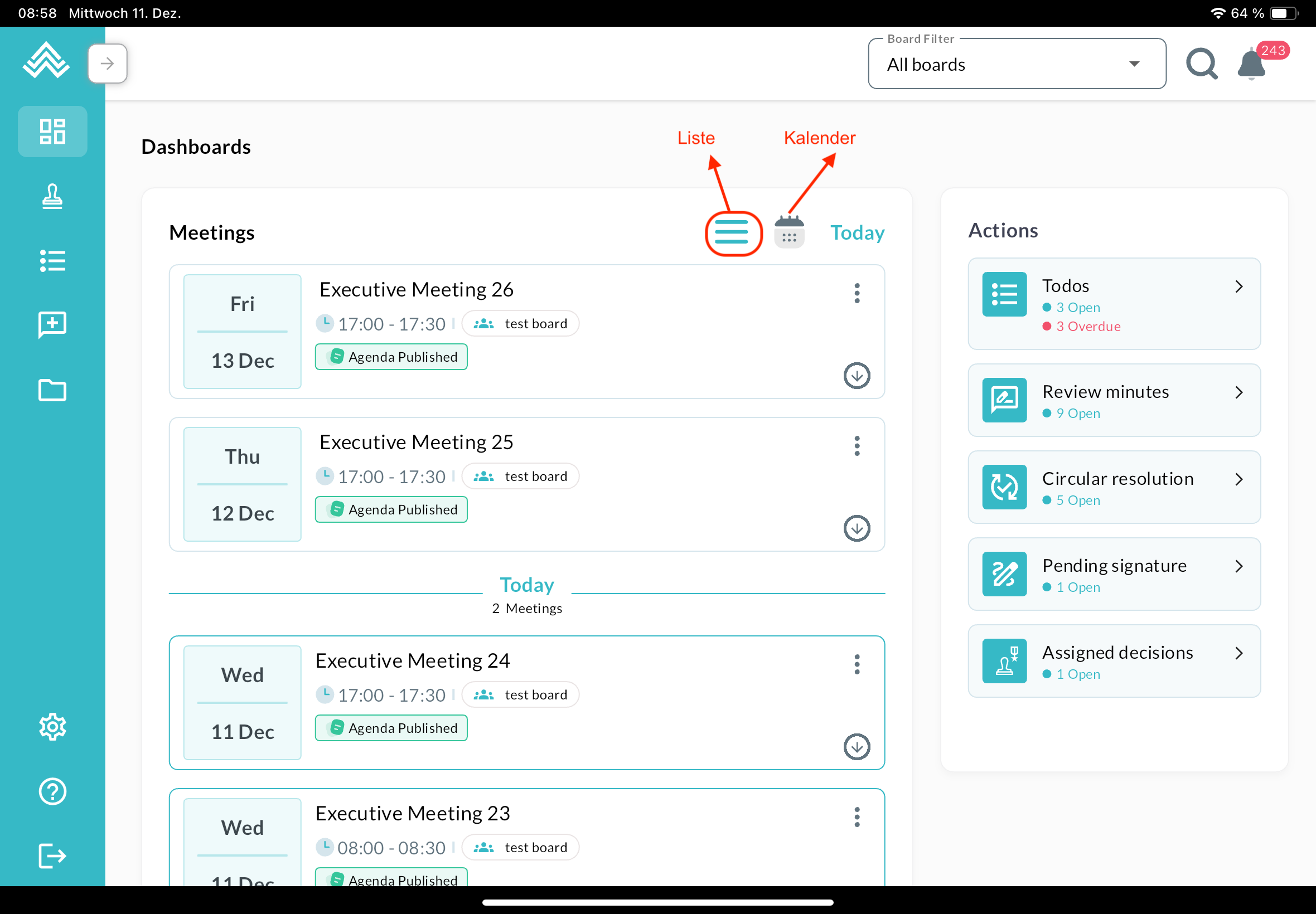 Das Dashboard entspricht dem in der Web-App, mit den Sitzungen auf der linken Seite und den anstehenden Aktionen auf der rechten Seite. Der Board-Filter befindet sich oben, neben der Such-Schaltfläche und dem Benachrichtigungs-Icon. Das Menü auf der linken Seite kann erweitert werden: