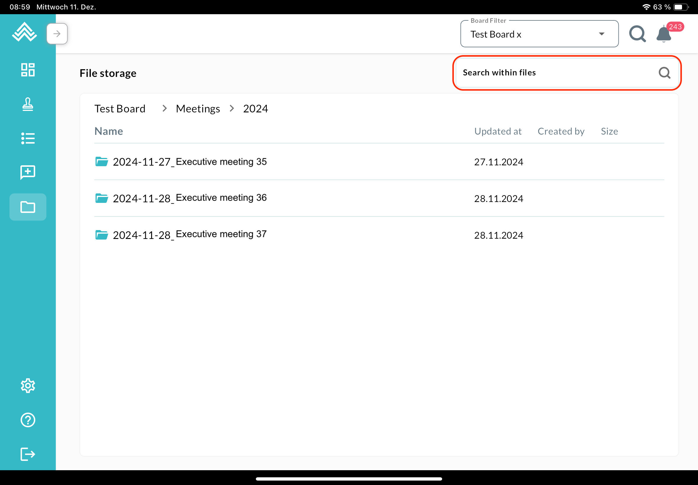 Die Suchfunktion funktioniert wie in der Web-Version und zeigt die jeweiligen Ergebnisse nach Beschlüssen, To-dos, Protokollen und Dokumenten getrennt: