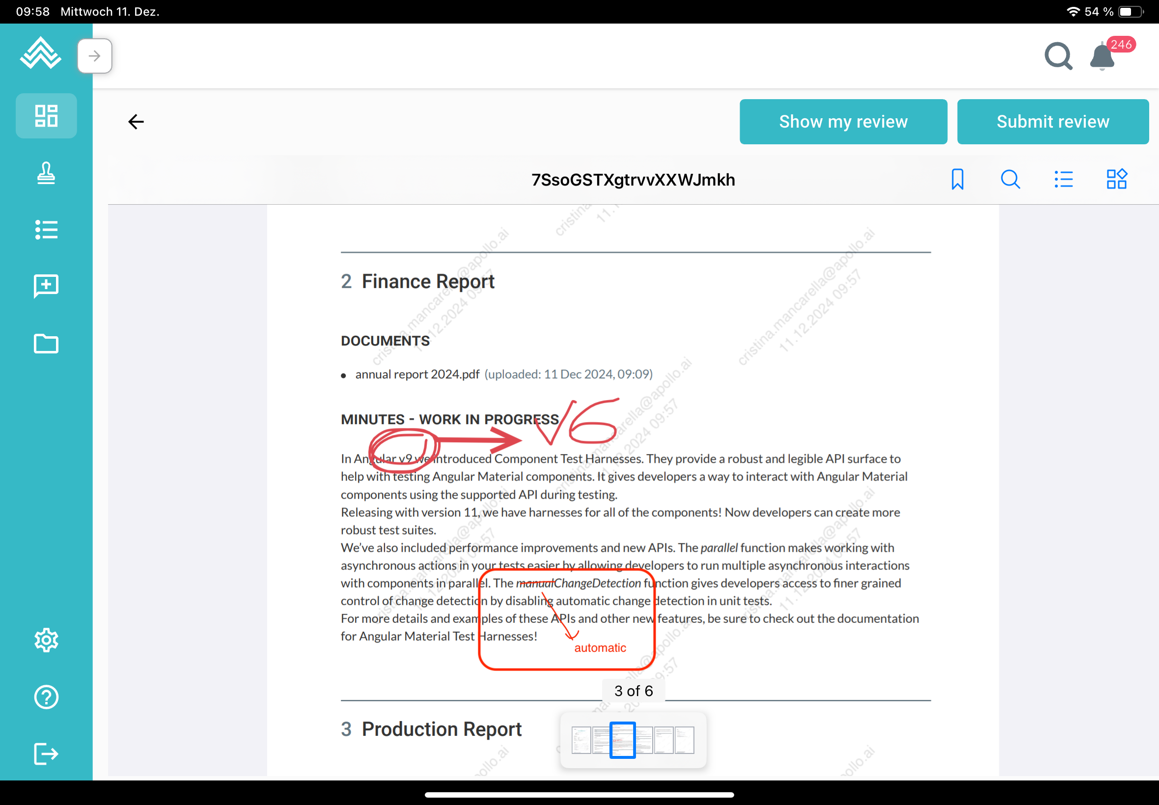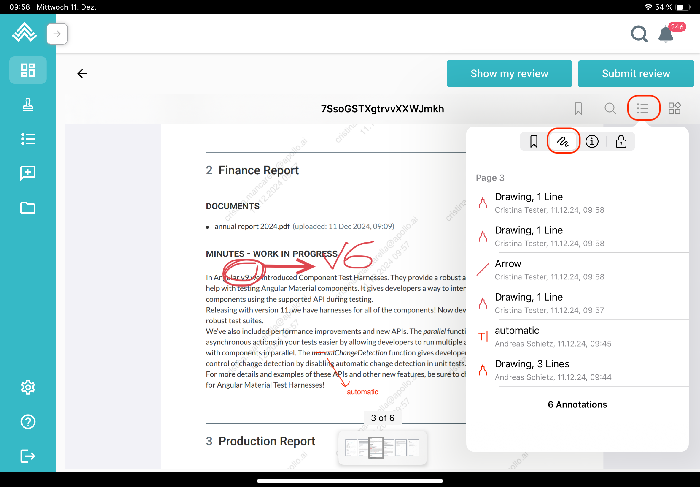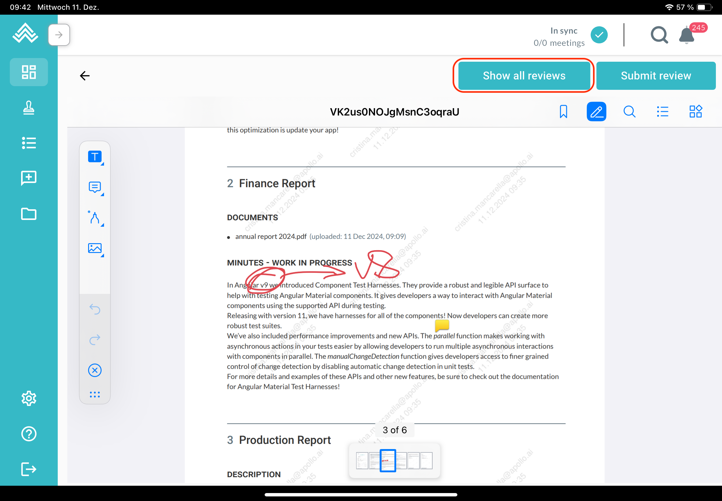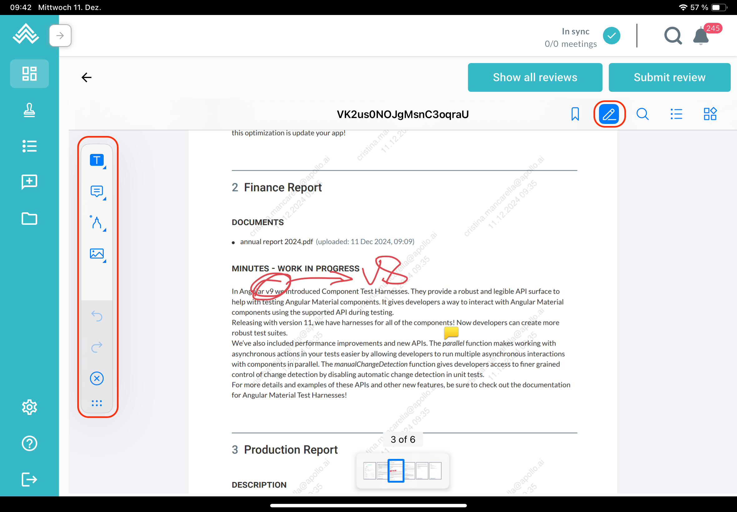 Wenn Ihre Protokollüberprüfung angefordert wird, werden Sie benachrichtigt und gelangen zum PDF-Viewer. Klicken Sie auf das "Bearbeiten"-Symbol, um die Werkzeug-Seitenleiste zu öffnen und Ihre Kommentare ganz einfach mit dem Tablet-Stift oder der Tastatur hinzuzufügen, je nach Präferenz: