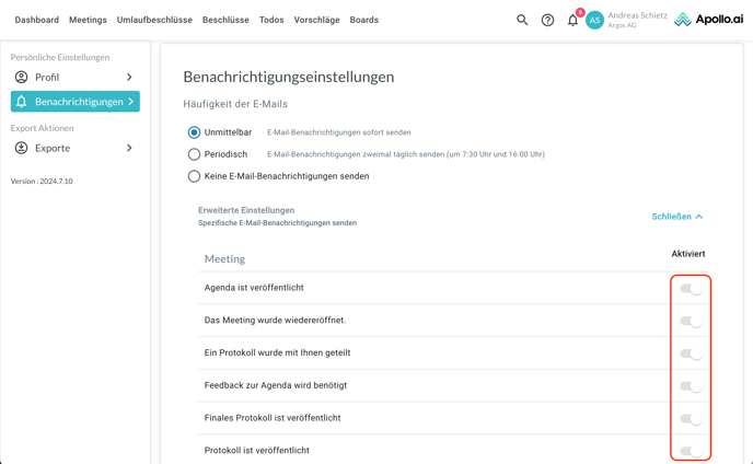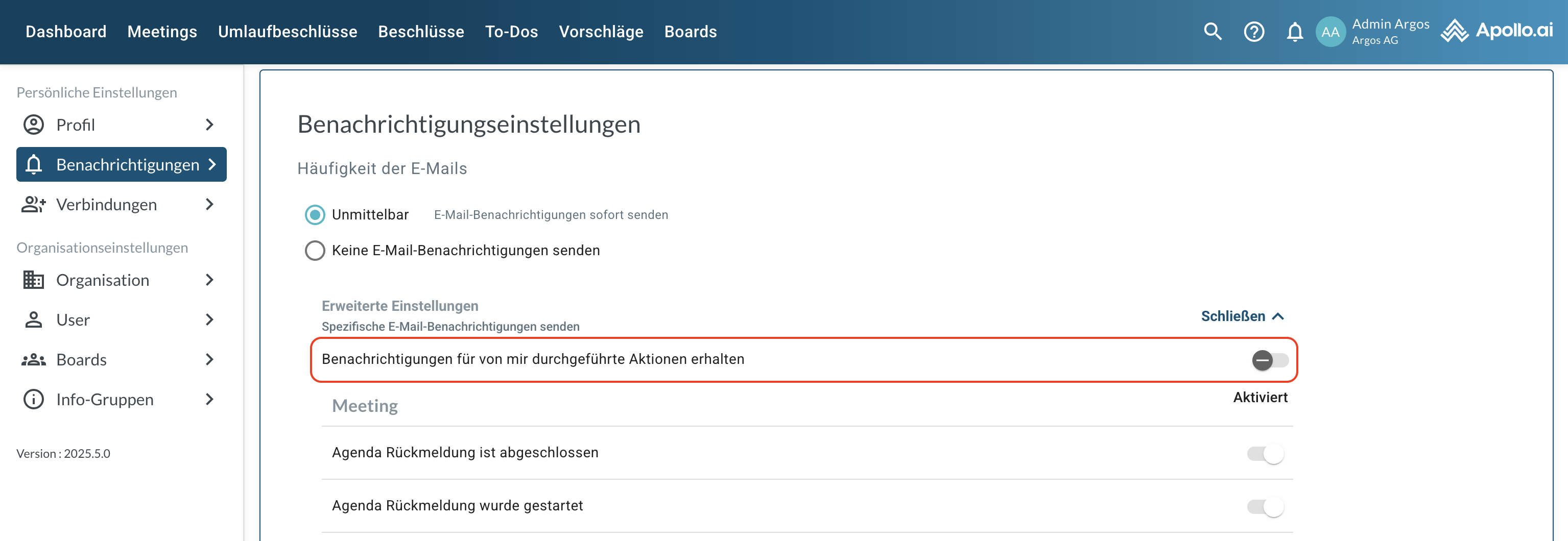 Aktivieren Sie die Option „Benachrichtigungen über von mir durchgeführte Aktionen erhalten“, um E-Mail-/Systembenachrichtigungen über von Ihnen selbst ausgelöste Aktionen zu erhalten (z. B. wenn Sie als Board Organizer eine Agenda veröffentlichen):