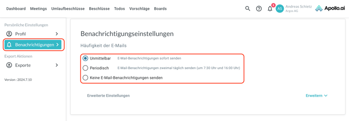 Navigieren Sie über die linke Spalte zu "Benachrichtigungen". Sie können nun die Häufigkeit Ihrer E-Mail-Benachrichtigungen bestimmen: