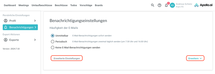 Klicken Sie unten auf "Erweiterte Einstellungen" oder auf "Erweitern", um spezifische Benachrichtigungen ein- bzw. auszuschalten: