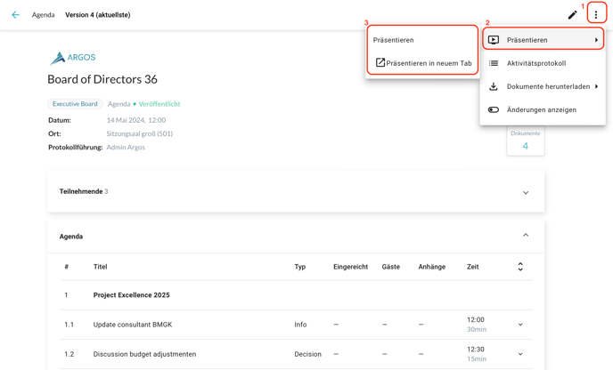 Um den Präsentationsmodus zu starten, klicken Sie auf das 3-Punkte-Menü in der Agenda und dann auf „Präsentieren“. Jetzt können Sie wählen, ob der Präsentationsmodus im gleichen Browser-Tab oder in einem neuen Tab geöffnet werden soll:
