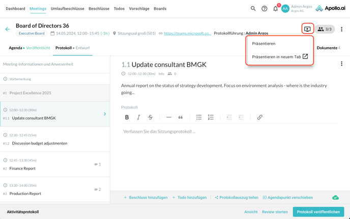 Als Board-Organisator können Sie den Präsentationsmodus direkt aus der Tagesordnung oder dem Protokolleditor heraus öffnen, indem Sie oben rechts auf das Play-Symbol klicken. Es empfiehlt sich, die Präsentation in einem neuen Tab zu öffnen, um das Protokoll zu verfassen und gleichzeitig die Präsentation per Screensharing zu teilen: