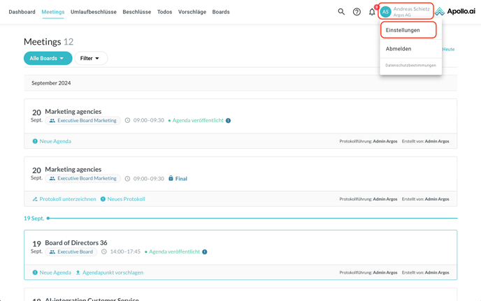Klicken Sie auf Ihr Profilbild oben rechts, dann auf "Einstellungen":