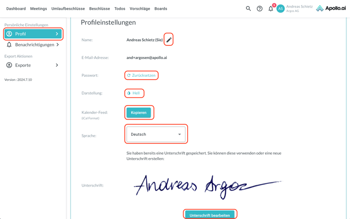 Navigieren Sie über die linke Spalte zu "Profil". Sie können nun Ihren im System angezeigten Namen ändern, Ihr Passwort zurücksetzen, den Kalender-Feed-Link kopieren, die Sprache umstellen (Deutsch oder Englisch) und Ihre Signatur ändern: