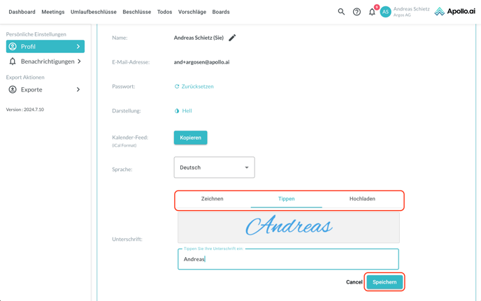 Wenn Sie eine neue Signatur speichern möchten, können Sie diese zeichnen, eintippen oder hochladen, bevor Sie unten rechts auf "Speichern" klicken: