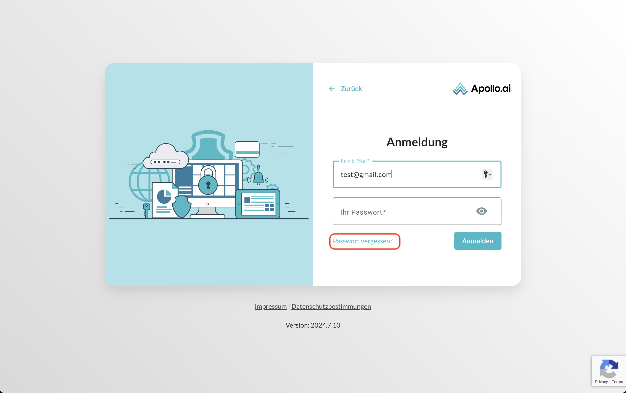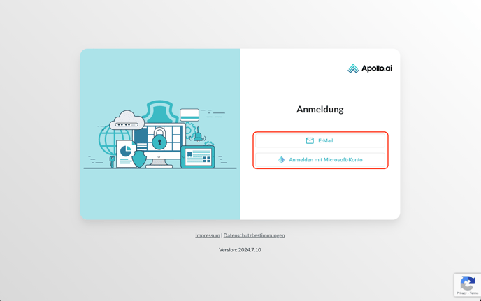 Folgen Sie dem Link app.apollo.ai, um zur Login-Seite zu gelangen, dann entscheiden Sie, ob Sie sich mit Ihrer E-Mail-Adresse oder mit Ihrem Microsoft-Konto einloggen möchten: