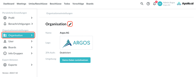 Navigieren Sie zu "Organisation" über die linke Spalte, dann klicken Sie rechts auf das Edit-Symbol: