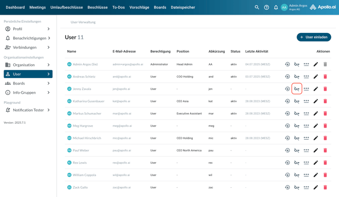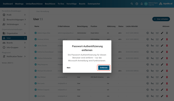 Wenn sich Ihre Organisation über Microsoft SSO bei Apollo anmeldet, können Sie für einen ausgewählten Benutzer die Anmeldung mit E-Mail und Passwort deaktivieren, sodass nur noch die SSO-Anmeldung für diesen User funktioniert. Klicken Sie dafür auf das Schlüsselsymbol und bestätigen Sie den Vorgang, indem Sie „Entfernen“ selektieren: