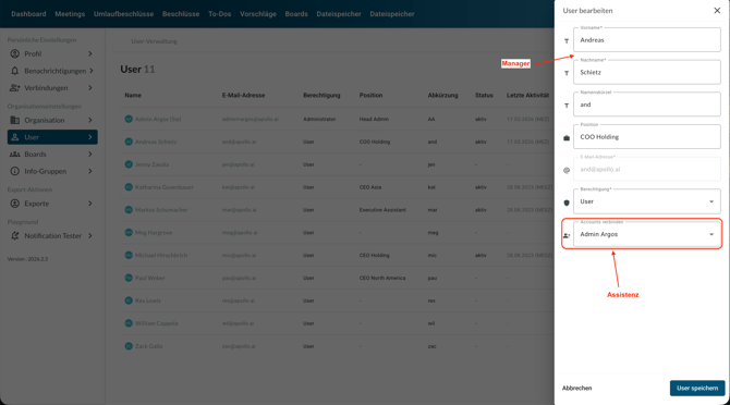 Beim Bearbeiten eines Board-Mitglieds oder eines Basic Users können Sie deren persönliche Assistenz mit dem Profil des Managers verknüpfen:
