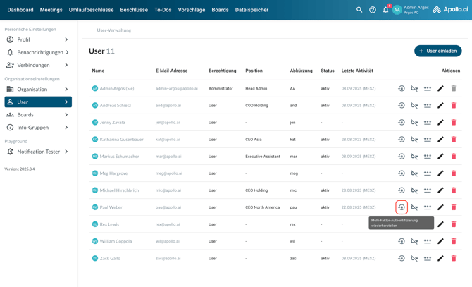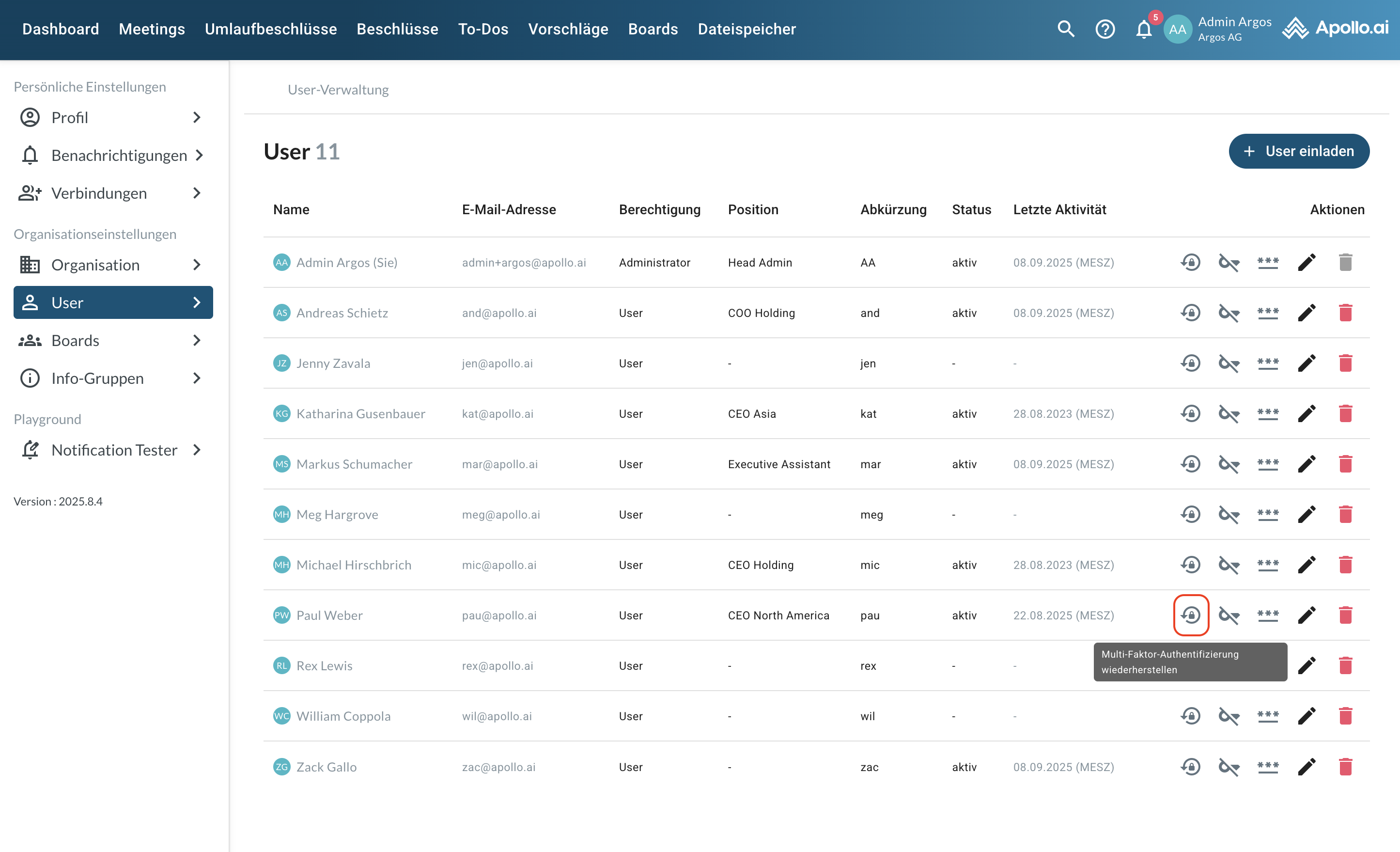 Wenn Ihre Organisation die Zwei-Faktor-Authentifizierung verwendet, können Sie den Zwei-Faktor-Authentifizierungsschlüssel zurücksetzen, falls ein Benutzer den Zugriff auf seine aktuelle Authenticator-App verliert und den QR-Code erneut scannen muss, um Apollo.ai in seiner neuen Authenticator-App hinzuzufügen: