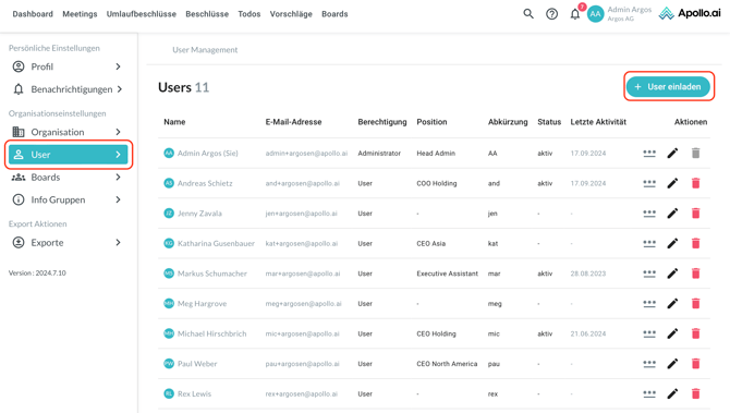Navigieren Sie zu "User" über die linke Spalte, dann klicken Sie rechts auf "User einladen", um einen neuen Benutzer anzulegen: