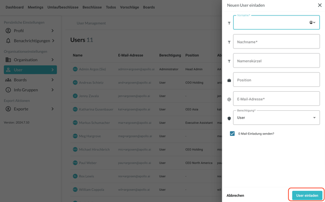 Füllen Sie die Maske aus, dann klicken Sie unten rechts auf "User einladen":