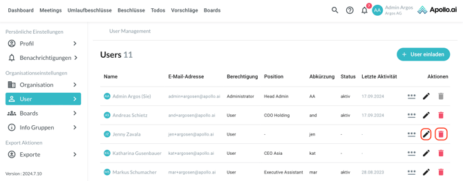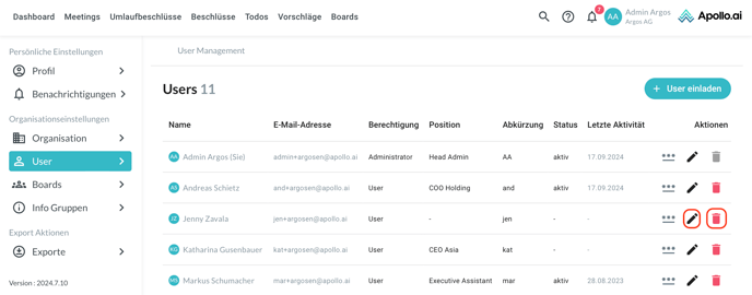 Sie können einen bestehenden Benutzer bearbeiten oder löschen, indem Sie rechts auf das entsprechende Symbol klicken: