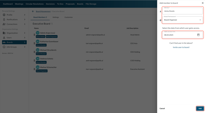 Newly added board members are granted viewer rights starting from the selected date, whereas newly added board organizers are granted edit rights.