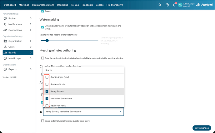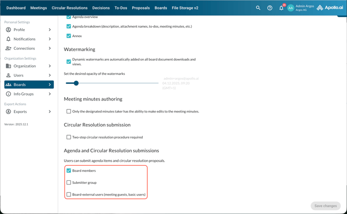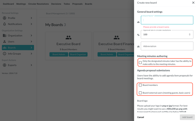 At the bottom of the page you can choose who should be allowed to propose agenda items and circular resolutions: board members only, a pre-selected submitter group (a Professional subscription is required for this option), or board-external users: