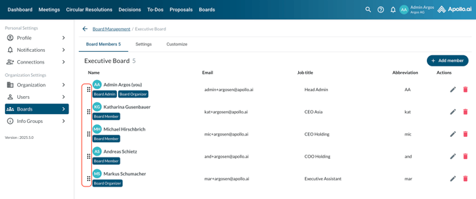 You can also sort the existing board members as desired through drag & drop. The new order will apply to all meeting and circular resolution participant lists: