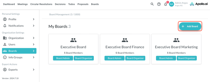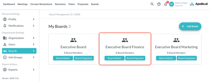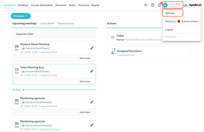 In the "Settings" section you can change general settings such as the board name, the approval rate for circular resolutions and the board logo: