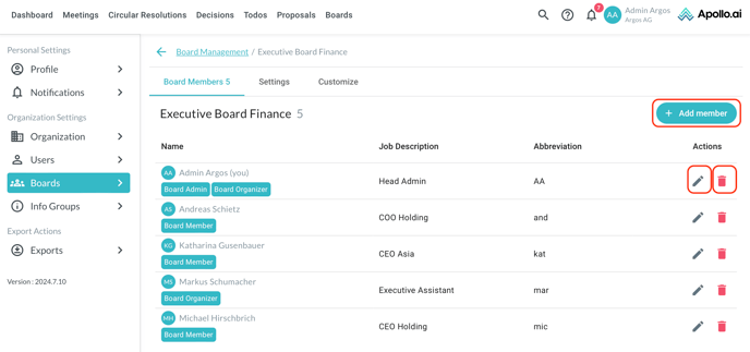 You can add, edit, or remove board members through the corresponding buttons: