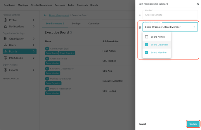 By clicking on the edit symbol on the right side of the board member overview, you can change the board permissions for the selected member. Click on "Update" at the bottom once done: