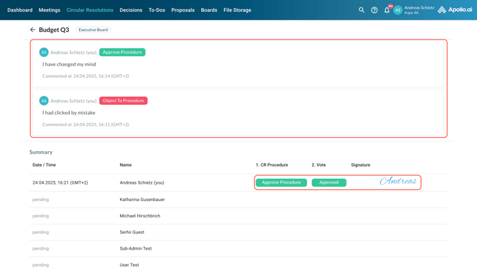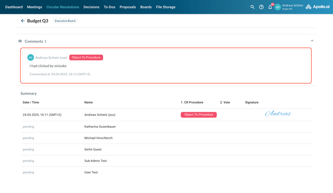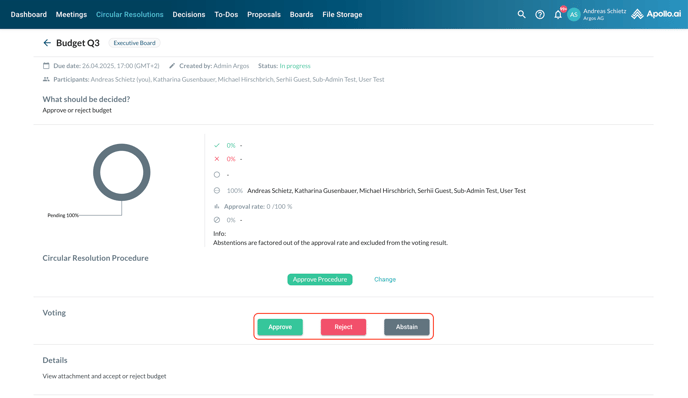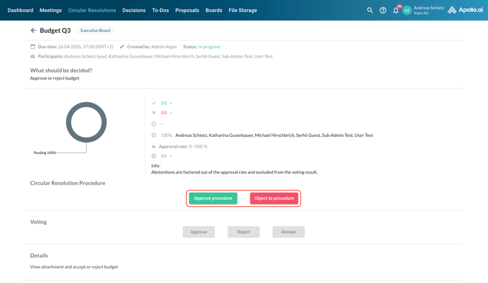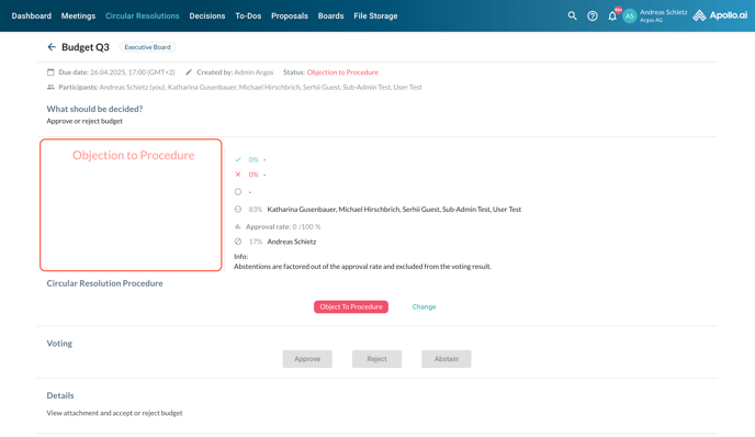 If you object to the procedure, the circular resolution process is completed for you. The pie chart on the voting progress will not be shown, however you can still see the votes by the other board members on the right side of the page: