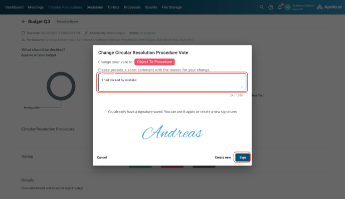 Confirm your choice and sign your vote if required (based on the resolution settings). You can choose to either create a new signature or use the existing one: