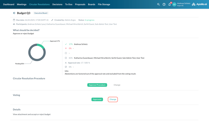 After voting on the circular resolution content, you can still change your vote to a different option if needed, however you cannot change your approval to the circular resolution process any longer: