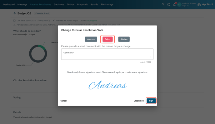 The second step requires you to approve, reject, or (if the corresponding setting is enabled) abstain from voting on the contents of the circular resolution. Your can cast your vote by clicking on the corresponding button:
