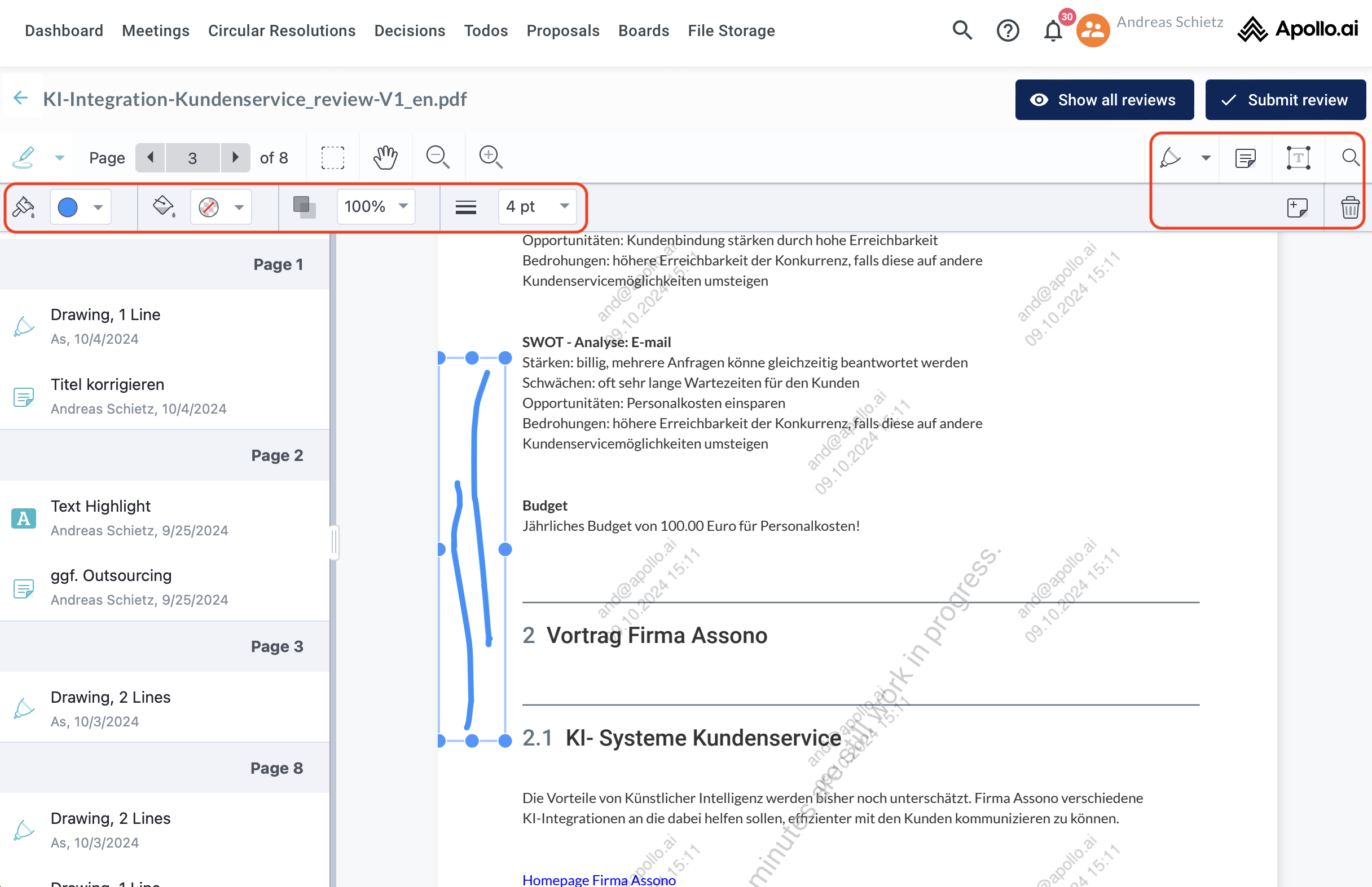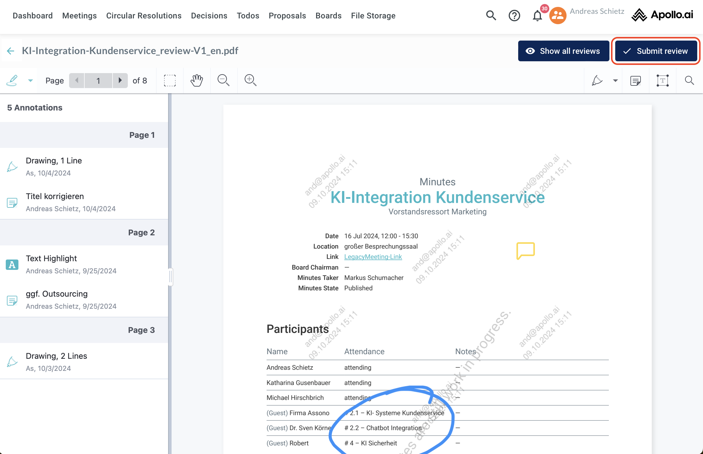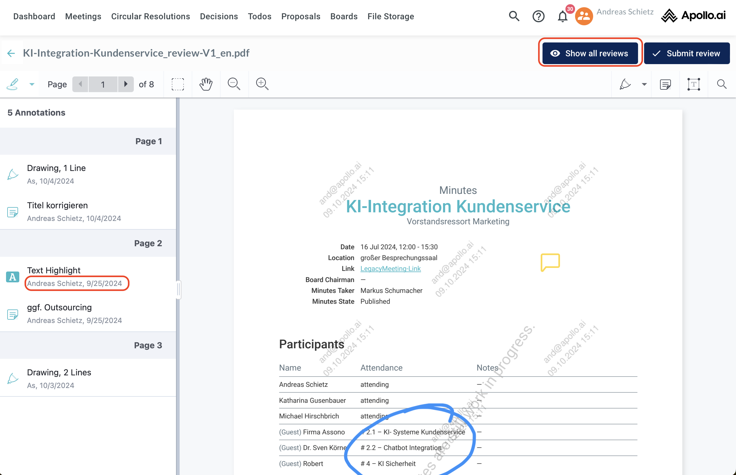 You can see all annotations and comments in the left column, as well as the name of the user who added the note and the review date. Easily switch between 'Show all reviews' and 'Show my reviews' through the button in the top-right corner based on whether you would like to see the other board members' reviews as well: