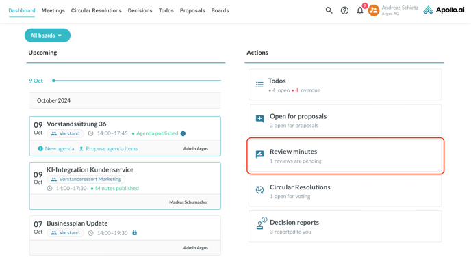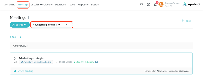 You are redirected to the 'Meetings' tab, filtered by 'Your pending reviews'. Select a meeting from the list: