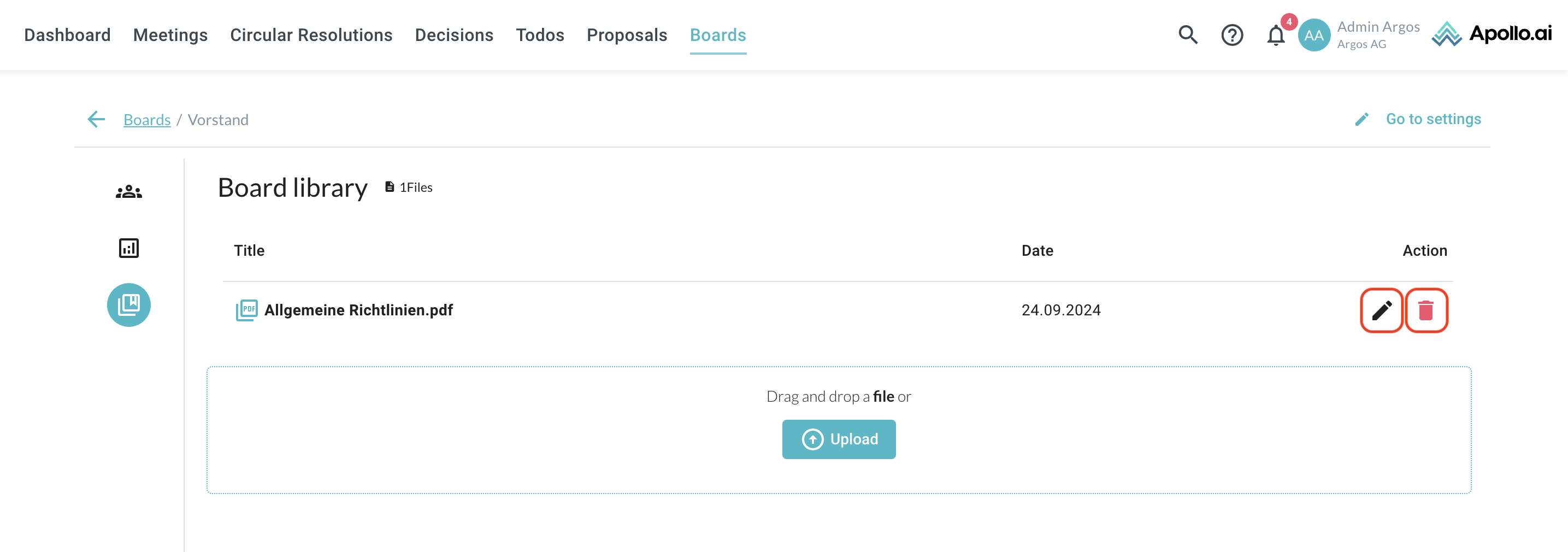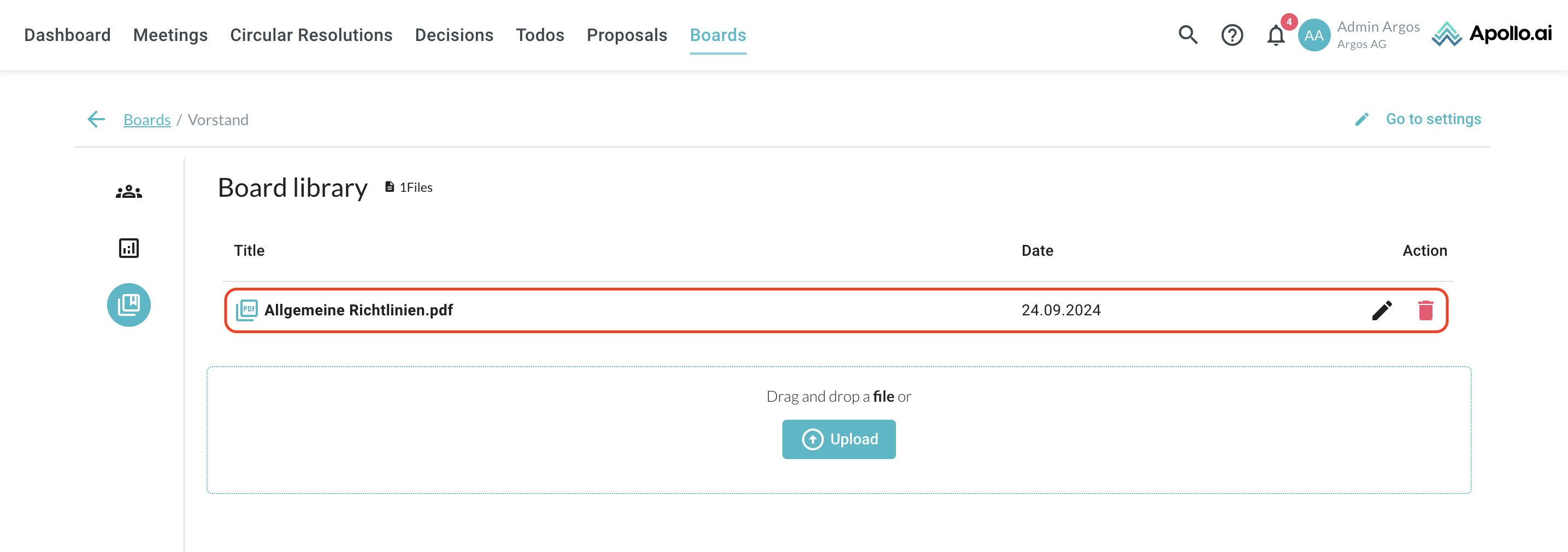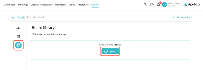 Navigate to "Board library" in the left column, then drag & drop a document or upload a file through the "Upload" button: