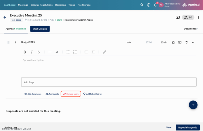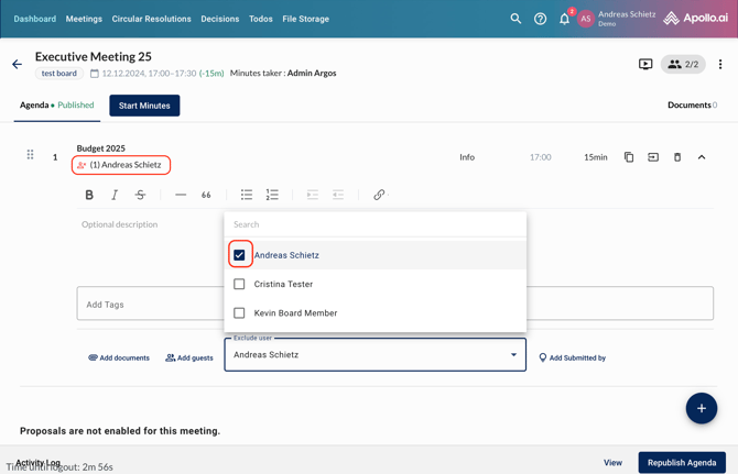 You can also exclude a specific board member from one or more agenda items through the button 'Exclude board members'. The indicated user is not going to see neither the agenda item description nor the minutes or any other item related to that agenda point: