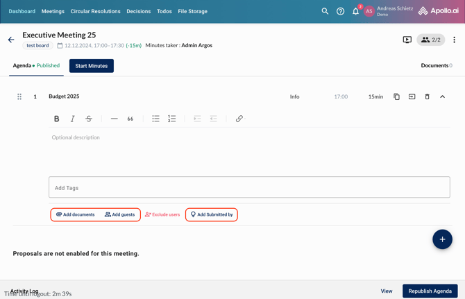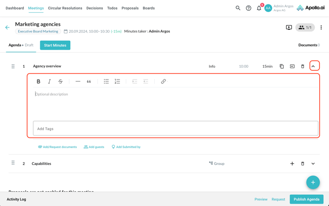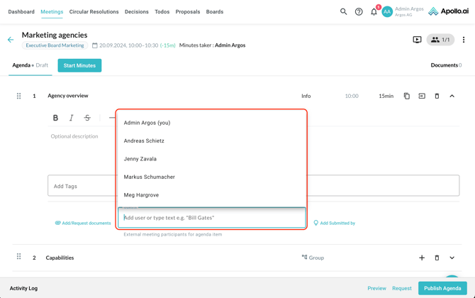 Use the options below each item to upload or request documents, add guests to an individual item, or indicate the name of the user that submitted the item proposal in case they did not submit it through Apollo.ai but to you directly (for example by email):