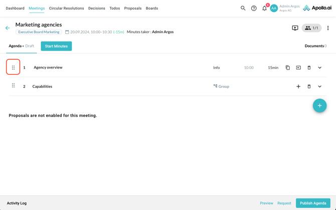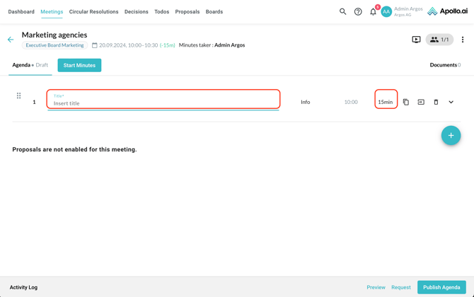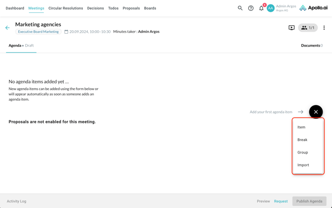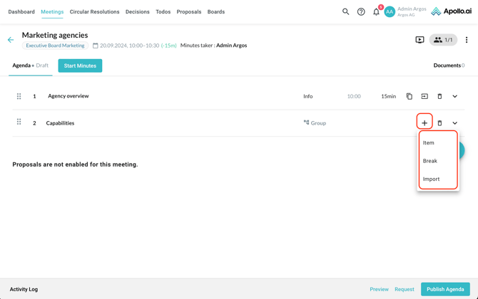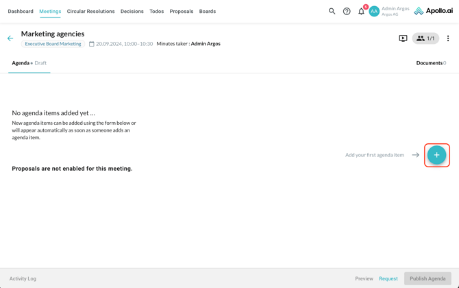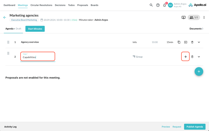 After creating a new meeting, you are redirected to the agenda edit mode. Add your first agenda item by clicking on the "+" symbol on the right: