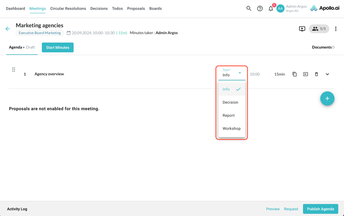 You can also change the item type based on the nature of the session (information, decision, report, or workshop):