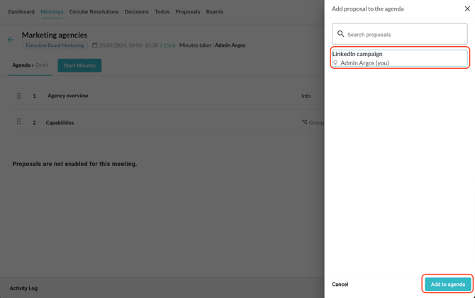 If you choose to import an item proposal, select the desired proposal from the list, then click on "Add to agenda" in the bottom-right corner: